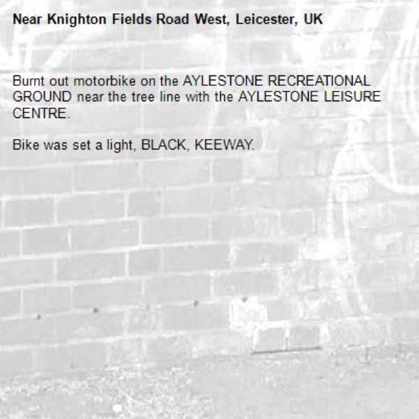 Burnt out motorbike on the AYLESTONE RECREATIONAL GROUND near the tree line with the AYLESTONE LEISURE CENTRE.