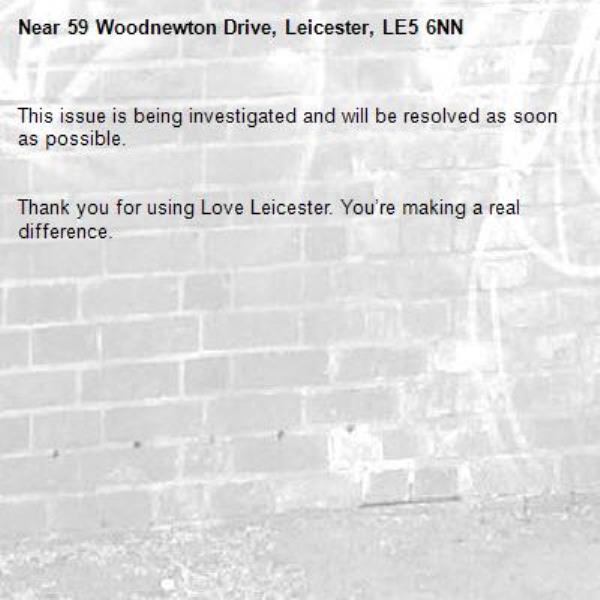 -59 Woodnewton Drive, Leicester, LE5 6NN 24/02/2026 12:35 This issue is being investigated and will be resolved as soon as possible. Thank you for using Love Leicester. You’re making a real difference.