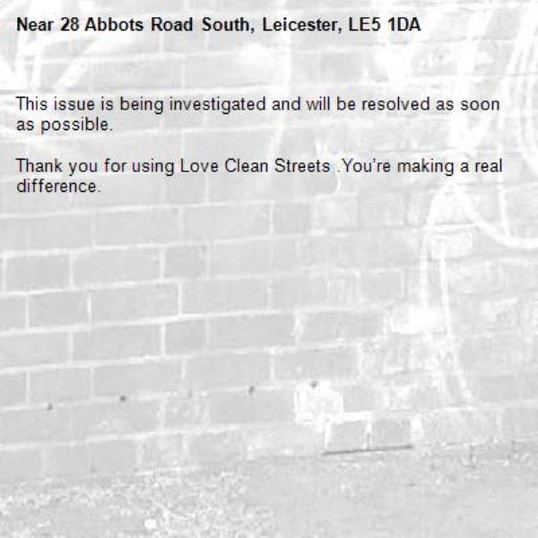 -28 Abbots Road South, Leicester, LE5 1DA 24/02/2026 12:03 This issue is being investigated and will be resolved as soon as possible. Thank you for using Love Clean Streets .You’re making a real difference.