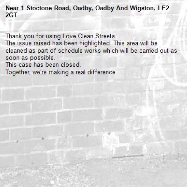 -1 Stoctone Road, Oadby, Oadby And Wigston, LE2 2GT 13/04/2026 10:22 Thank you for using Love Clean Streets