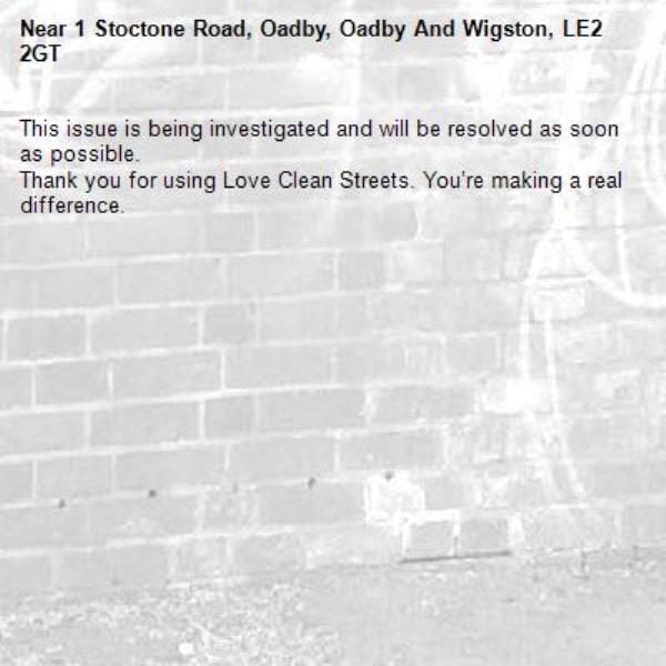 -1 Stoctone Road, Oadby, Oadby And Wigston, LE2 2GT 13/04/2026 10:21 This issue is being investigated and will be resolved as soon as possible. Thank you for using Love Clean Streets. You’re making a real difference.