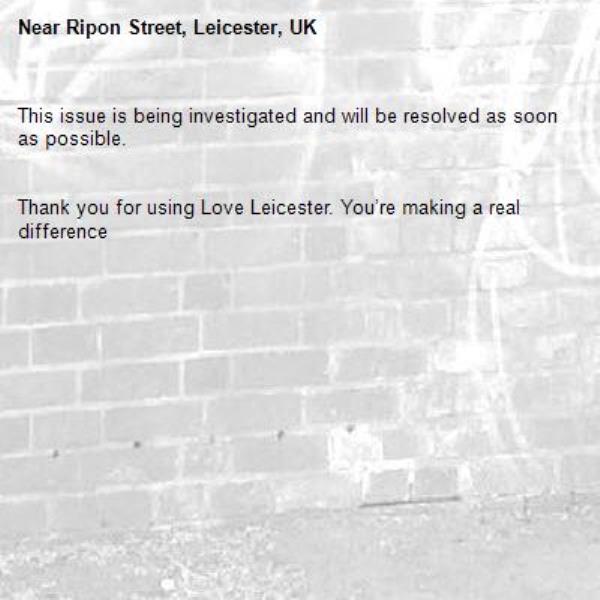 -Ripon Street, Leicester, UK 27/02/2026 10:57 This issue is being investigated and will be resolved as soon as possible. Thank you for using Love Leicester. You’re making a real difference