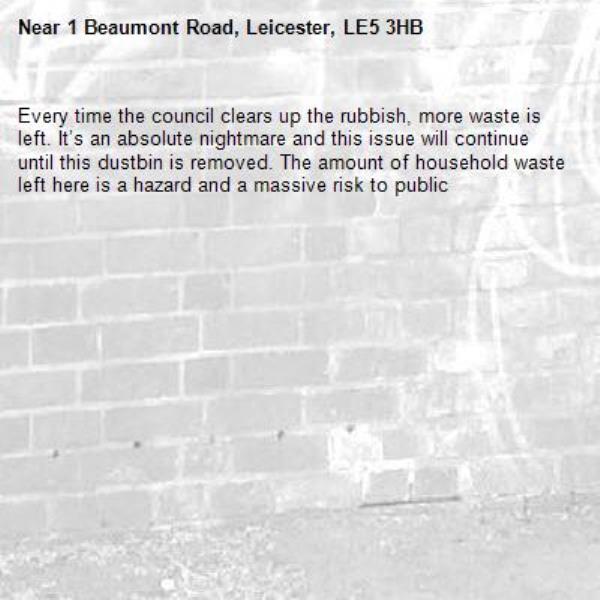 Every time the council clears up the rubbish, more waste is left. It’s an absolute nightmare and this issue will continue until this dustbin is removed. The amount of household waste left here is a hazard and a massive risk to public