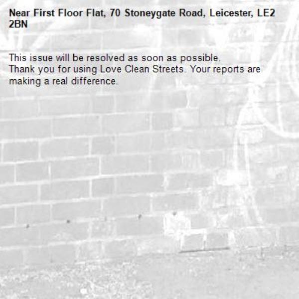 -First Floor Flat, 70 Stoneygate Road, Leicester, LE2 2BN 26/03/2026 09:45 This issue will be resolved as soon as possible. Thank you for using Love Clean Streets. Your reports are making a real difference.