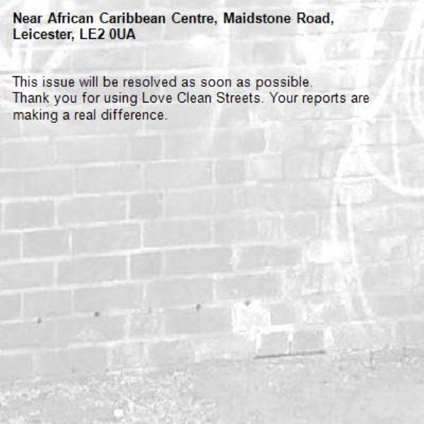 -African Caribbean Centre, Maidstone Road, Leicester, LE2 0UA 04/04/2026 10:39 This issue will be resolved as soon as possible. Thank you for using Love Clean Streets. Your reports are making a real difference.