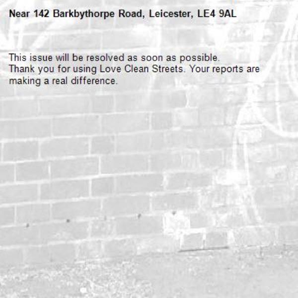 -142 Barkbythorpe Road, Leicester, LE4 9AL 19/04/2026 16:13 This issue will be resolved as soon as possible. Thank you for using Love Clean Streets. Your reports are making a real difference.