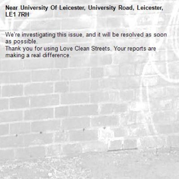 -University Of Leicester, University Road, Leicester, LE1 7RH 30/01/2026 13:25 We’re investigating this issue, and it will be resolved as soon as possible. Thank you for using Love Clean Streets. Your reports are making a real difference.