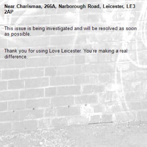 -Charismaa, 266A, Narborough Road, Leicester, LE3 2AP 21/04/2026 14:37 This issue is being investigated and will be resolved as soon as possible. Thank you for using Love Leicester. You’re making a real difference.