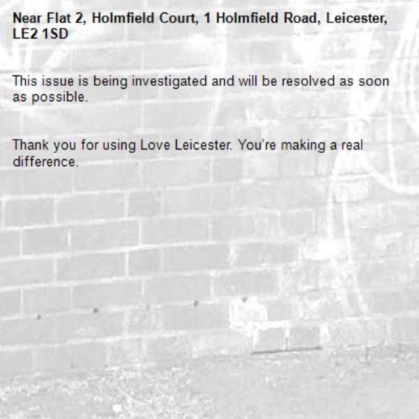 -Flat 2, Holmfield Court, 1 Holmfield Road, Leicester, LE2 1SD 12/03/2026 13:48 This issue is being investigated and will be resolved as soon as possible. Thank you for using Love Leicester. You’re making a real difference.