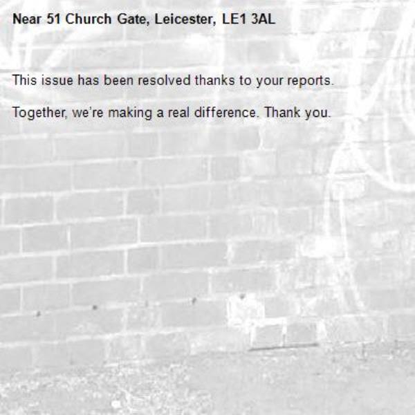 -51 Church Gate, Leicester, LE1 3AL 23/12/2025 09:44 This issue has been resolved thanks to your reports. Together, we’re making a real difference. Thank you.