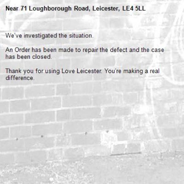 -71 Loughborough Road, Leicester, LE4 5LL 17/02/2026 12:09 We’ve investigated the situation. An Order has been made to repair the defect and the case has been closed. Thank you for using Love Leicester. You’re making a real difference.
