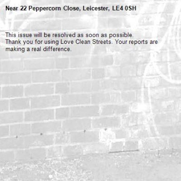 -22 Peppercorn Close, Leicester, LE4 0SH 10/04/2026 12:33 This issue will be resolved as soon as possible. Thank you for using Love Clean Streets. Your reports are making a real difference.