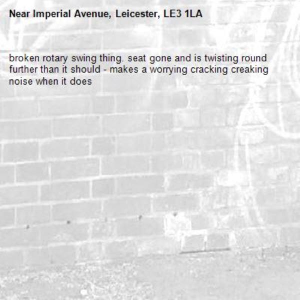 broken rotary swing thing. seat gone and is twisting round further than it should - makes a worrying cracking creaking noise when it does