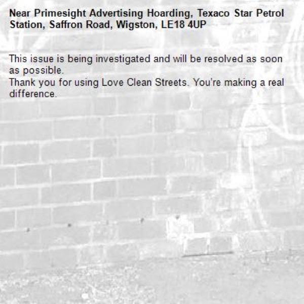 -Primesight Advertising Hoarding, Texaco Star Petrol Station, Saffron Road, Wigston, LE18 4UP 16/04/2026 07:37 This issue is being investigated and will be resolved as soon as possible. Thank you for using Love Clean Streets. You’re making a real difference.