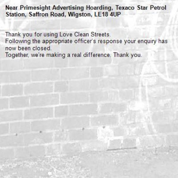 -Primesight Advertising Hoarding, Texaco Star Petrol Station, Saffron Road, Wigston, LE18 4UP 16/04/2026 07:38 Thank you for using Love Clean Streets.