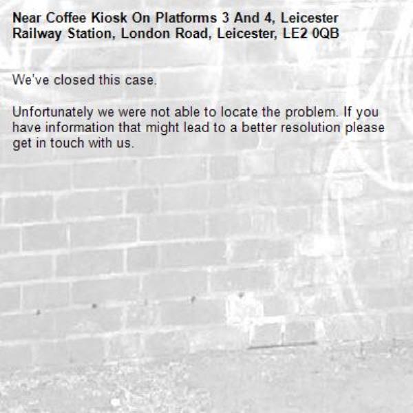-Coffee Kiosk On Platforms 3 And 4, Leicester Railway Station, London Road, Leicester, LE2 0QB 15/01/2026 13:46 We’ve closed this case. Unfortunately we were not able to locate the problem. If you have information that might lead to a better resolution please get in touch with us.