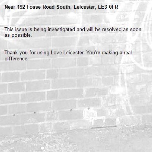 -192 Fosse Road South, Leicester, LE3 0FR 31/10/2025 09:43 This issue is being investigated and will be resolved as soon as possible. Thank you for using Love Leicester. You’re making a real difference.