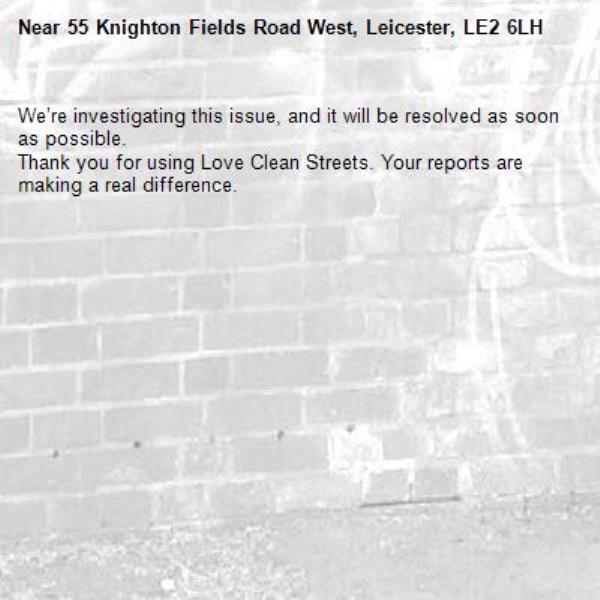 -55 Knighton Fields Road West, Leicester, LE2 6LH 08/10/2025 08:03 We’re investigating this issue, and it will be resolved as soon as possible. Thank you for using Love Clean Streets. Your reports are making a real difference.