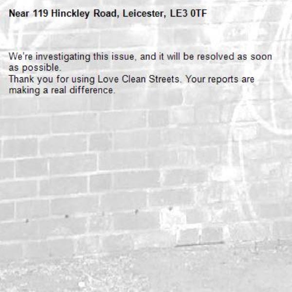-119 Hinckley Road, Leicester, LE3 0TF 26/02/2026 09:27 We’re investigating this issue, and it will be resolved as soon as possible. Thank you for using Love Clean Streets. Your reports are making a real difference.
