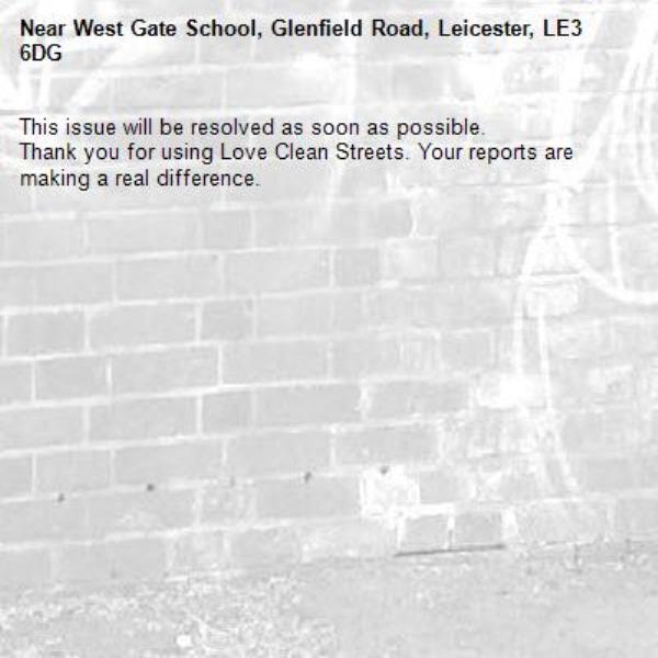 -West Gate School, Glenfield Road, Leicester, LE3 6DG 02/04/2026 07:26 This issue will be resolved as soon as possible. Thank you for using Love Clean Streets. Your reports are making a real difference.