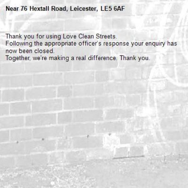 -76 Hextall Road, Leicester, LE5 6AF 20/02/2026 08:03 Thank you for using Love Clean Streets.