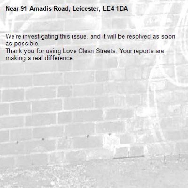 -91 Amadis Road, Leicester, LE4 1DA 12/03/2026 08:42 We’re investigating this issue, and it will be resolved as soon as possible. Thank you for using Love Clean Streets. Your reports are making a real difference.