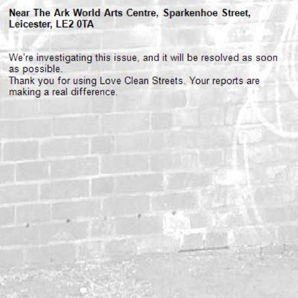 -The Ark World Arts Centre, Sparkenhoe Street, Leicester, LE2 0TA 29/10/2025 09:47 We’re investigating this issue, and it will be resolved as soon as possible. Thank you for using Love Clean Streets. Your reports are making a real difference.