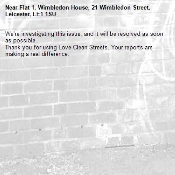-Flat 1, Wimbledon House, 21 Wimbledon Street, Leicester, LE1 1SU 15/04/2026 11:50 We’re investigating this issue, and it will be resolved as soon as possible. Thank you for using Love Clean Streets. Your reports are making a real difference.