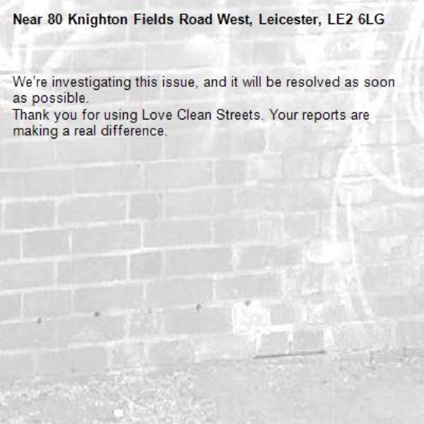 -80 Knighton Fields Road West, Leicester, LE2 6LG 25/03/2026 08:52 We’re investigating this issue, and it will be resolved as soon as possible. Thank you for using Love Clean Streets. Your reports are making a real difference.