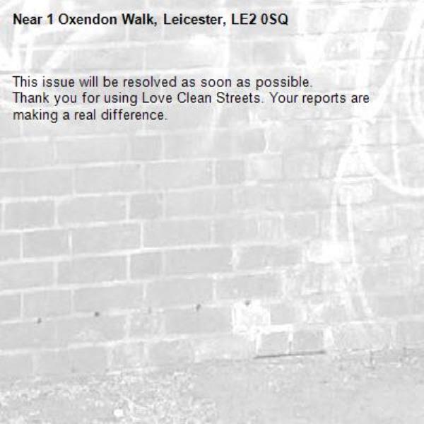 -1 Oxendon Walk, Leicester, LE2 0SQ 02/04/2026 07:37 This issue will be resolved as soon as possible. Thank you for using Love Clean Streets. Your reports are making a real difference.