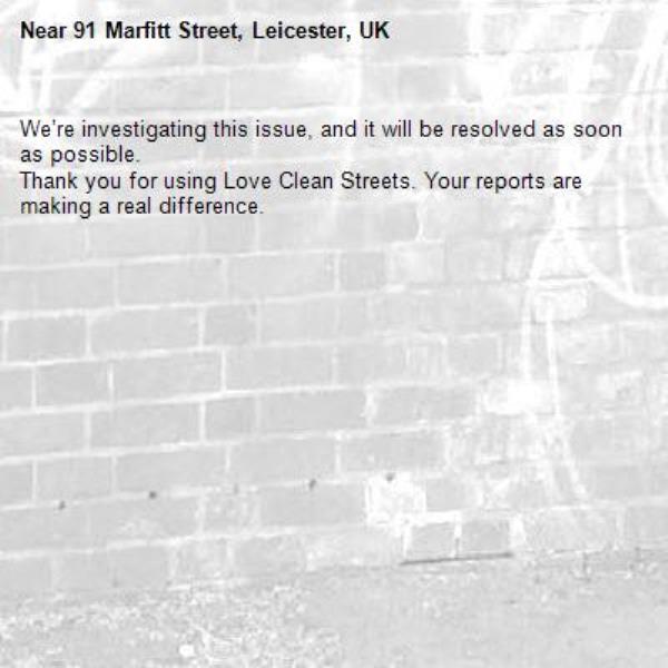 -91 Marfitt Street, Leicester, UK 30/12/2025 09:47 We’re investigating this issue, and it will be resolved as soon as possible. Thank you for using Love Clean Streets. Your reports are making a real difference.