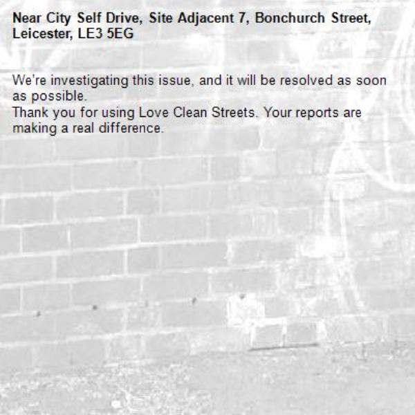 -City Self Drive, Site Adjacent 7, Bonchurch Street, Leicester, LE3 5EG 03/03/2026 13:10 We’re investigating this issue, and it will be resolved as soon as possible. Thank you for using Love Clean Streets. Your reports are making a real difference.