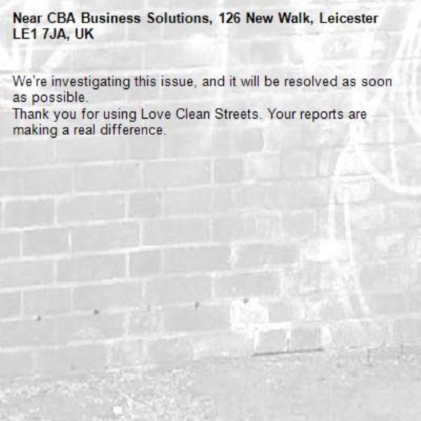 -CBA Business Solutions, 126 New Walk, Leicester LE1 7JA, UK 12/12/2025 11:04 We’re investigating this issue, and it will be resolved as soon as possible. Thank you for using Love Clean Streets. Your reports are making a real difference.