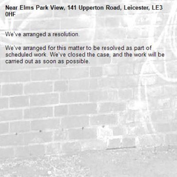 We’ve arranged for this matter to be resolved as part of scheduled work. We’ve closed the case, and the work will be carried out as soon as possible.