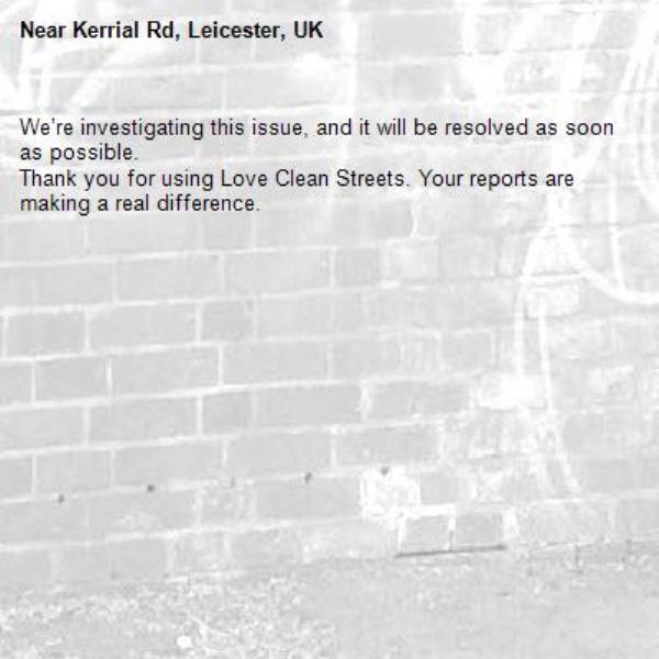 -Kerrial Rd, Leicester, UK 19/03/2026 11:40 We’re investigating this issue, and it will be resolved as soon as possible. Thank you for using Love Clean Streets. Your reports are making a real difference.