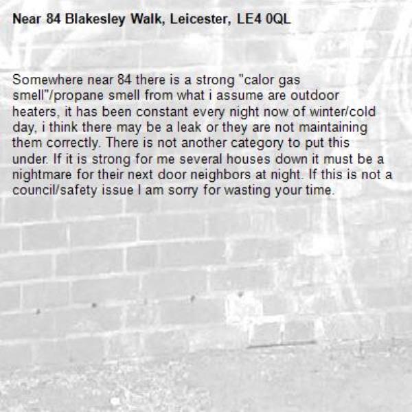 Somewhere near 84 there is a strong "calor gas smell"/propane smell from what i assume are outdoor heaters, it has been constant every night now of winter/cold day, i think there may be a leak or they are not maintaining them correctly. There is not another category to put this under. If it is strong for me several houses down it must be a nightmare for their next door neighbors at night. If this is not a council/safety issue I am sorry for wasting your time.-84 Blakesley Walk, Leicester, LE4 0QL