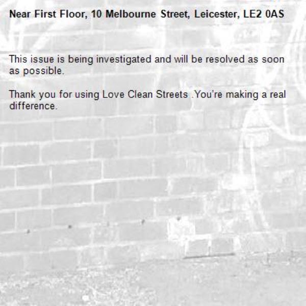 -First Floor, 10 Melbourne Street, Leicester, LE2 0AS 16/10/2025 14:28 This issue is being investigated and will be resolved as soon as possible. Thank you for using Love Clean Streets .You’re making a real difference.