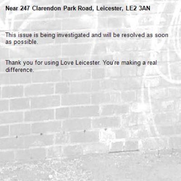 -247 Clarendon Park Road, Leicester, LE2 3AN 18/04/2026 13:57 This issue is being investigated and will be resolved as soon as possible. Thank you for using Love Leicester. You’re making a real difference.