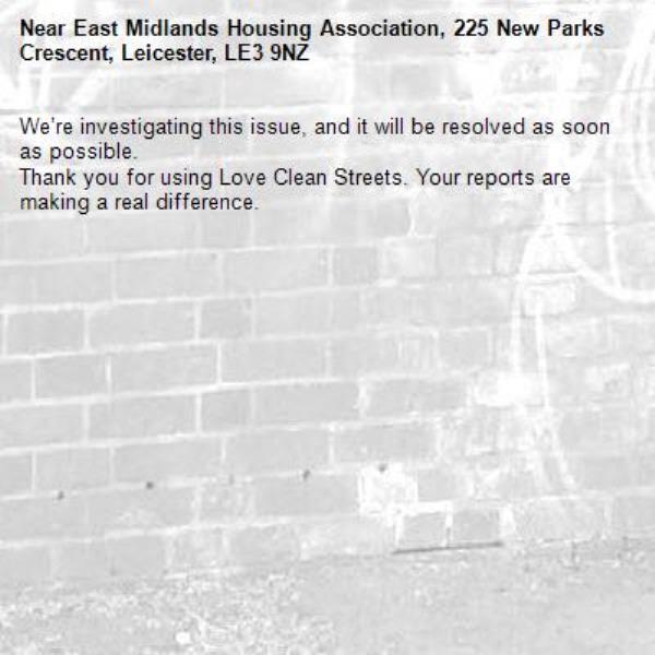 -East Midlands Housing Association, 225 New Parks Crescent, Leicester, LE3 9NZ 24/10/2025 11:12 We’re investigating this issue, and it will be resolved as soon as possible. Thank you for using Love Clean Streets. Your reports are making a real difference.