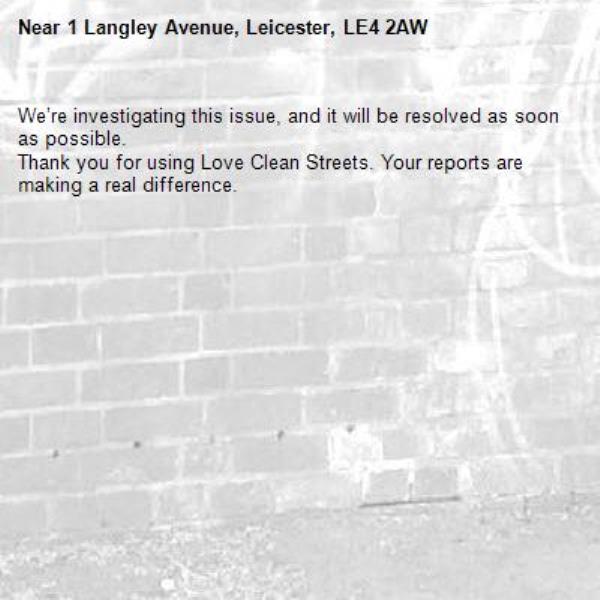 -1 Langley Avenue, Leicester, LE4 2AW 31/03/2026 08:04 We’re investigating this issue, and it will be resolved as soon as possible. Thank you for using Love Clean Streets. Your reports are making a real difference.