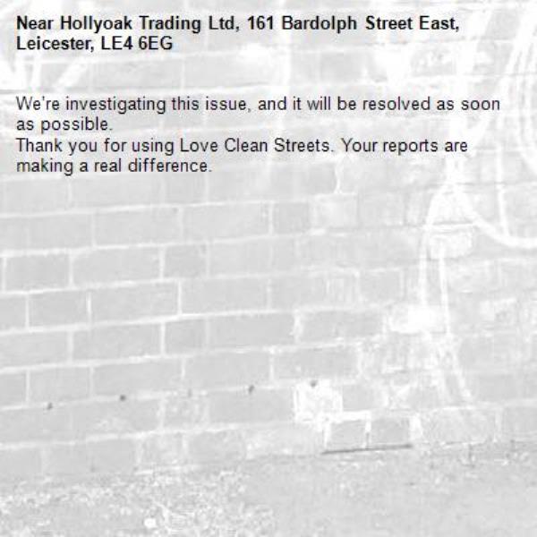-Hollyoak Trading Ltd, 161 Bardolph Street East, Leicester, LE4 6EG 19/11/2025 13:59 We’re investigating this issue, and it will be resolved as soon as possible. Thank you for using Love Clean Streets. Your reports are making a real difference.