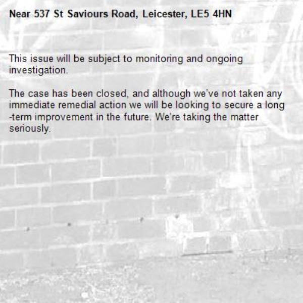 -537 St Saviours Road, Leicester, LE5 4HN 13/04/2026 13:23 This issue will be subject to monitoring and ongoing investigation. The case has been closed, and although we’ve not taken any immediate remedial action we will be looking to secure a long-term improvement in the future. We’re taking the matter seriously.