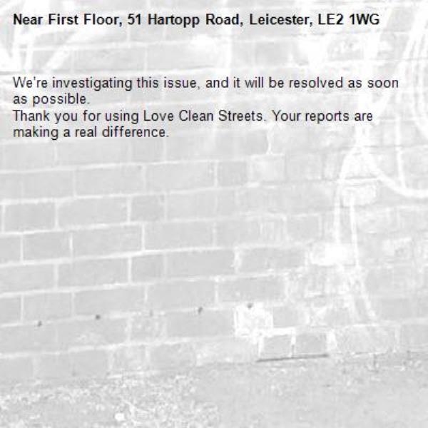 -First Floor, 51 Hartopp Road, Leicester, LE2 1WG 11/11/2025 08:44 We’re investigating this issue, and it will be resolved as soon as possible. Thank you for using Love Clean Streets. Your reports are making a real difference.