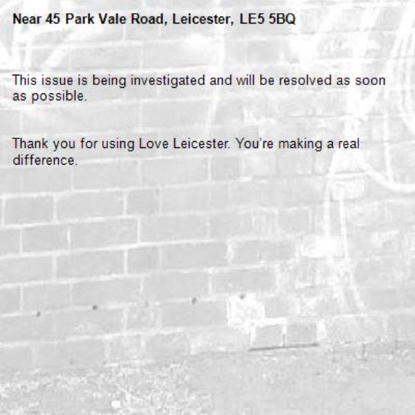 -45 Park Vale Road, Leicester, LE5 5BQ 07/04/2026 09:27 This issue is being investigated and will be resolved as soon as possible. Thank you for using Love Leicester. You’re making a real difference.