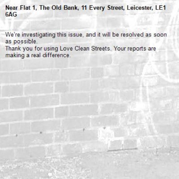-Flat 1, The Old Bank, 11 Every Street, Leicester, LE1 6AG 08/12/2025 09:25 We’re investigating this issue, and it will be resolved as soon as possible. Thank you for using Love Clean Streets. Your reports are making a real difference.